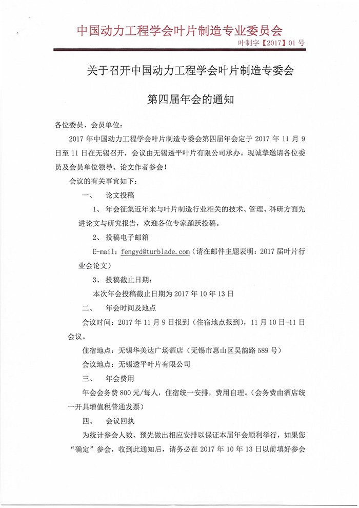 学会叶片制造专委会第四届年会通知
